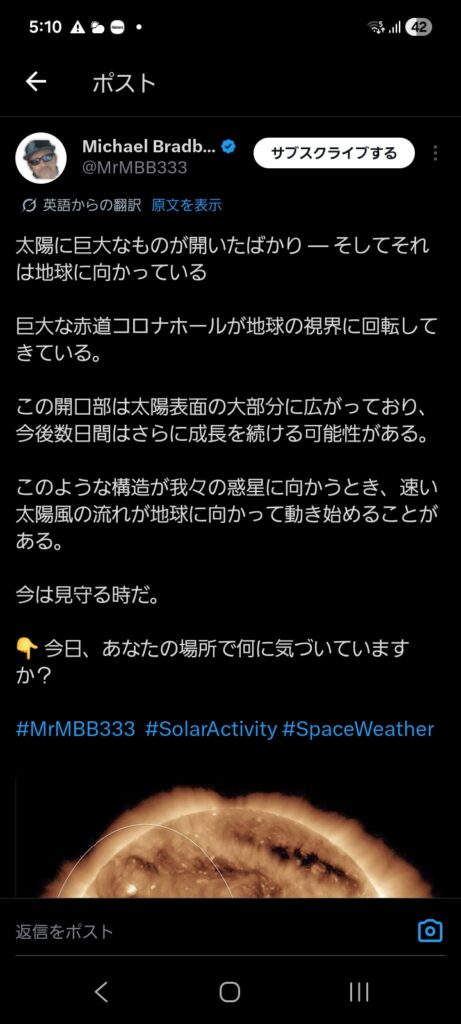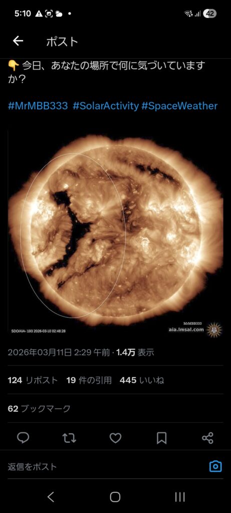 ここ数日、東北沖でM5以上の地震が数回発生しています。情報通信研究機構(NICT)は11月12日、太陽面で大規模な爆発現象(太陽フレア)が複数回発生し、地球方面への高速コロナガスの噴出を確認したと発表した。同日夜間から影響が出るおそれがあるとしています。11日PM7時過ぎX5.1の大規模な爆発が発生した影響です。太陽フレアの爆発時期と東北沖の地震は確実に因果関係があります。私が過去の巨大地震を分析した結果、月との引力関係があります。巨大地震のほとんどが新月から月齢5~8齢で発生しています。11月20日が新月です。24日から28日は特に要注意日です。又、巨大地震を観ると仏滅が多く、友引、赤口で発生しています。恐らく巨大地震はかなりの確率で近いと考えます。避難経路と備蓄等の準備は必須です。要警戒です。